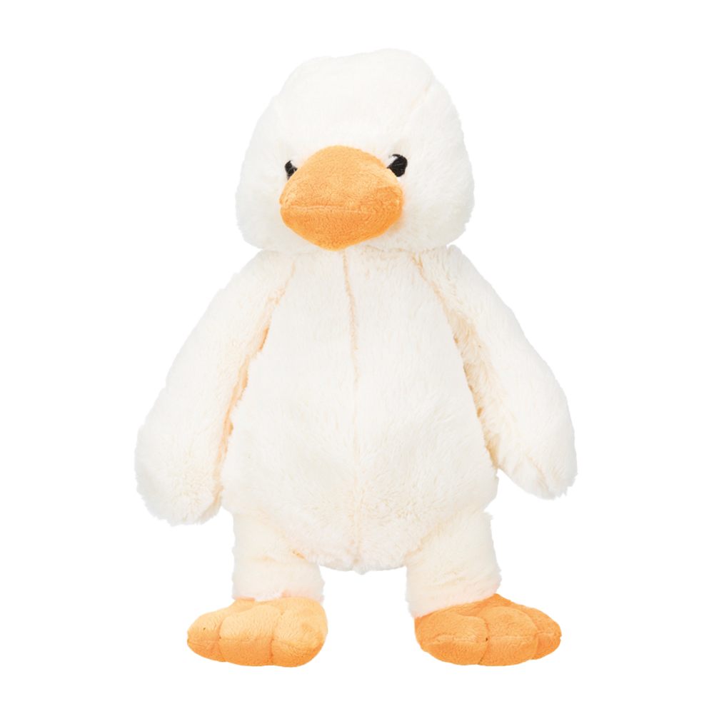 En sød og blød and lavet af plys med indbyggede lyde, der lokker til leg. Den rummelige størrelse gør den perfekt til at bære, ryste eller kæle med, og den glatte overflade er skånsom mod både tænder og poter.