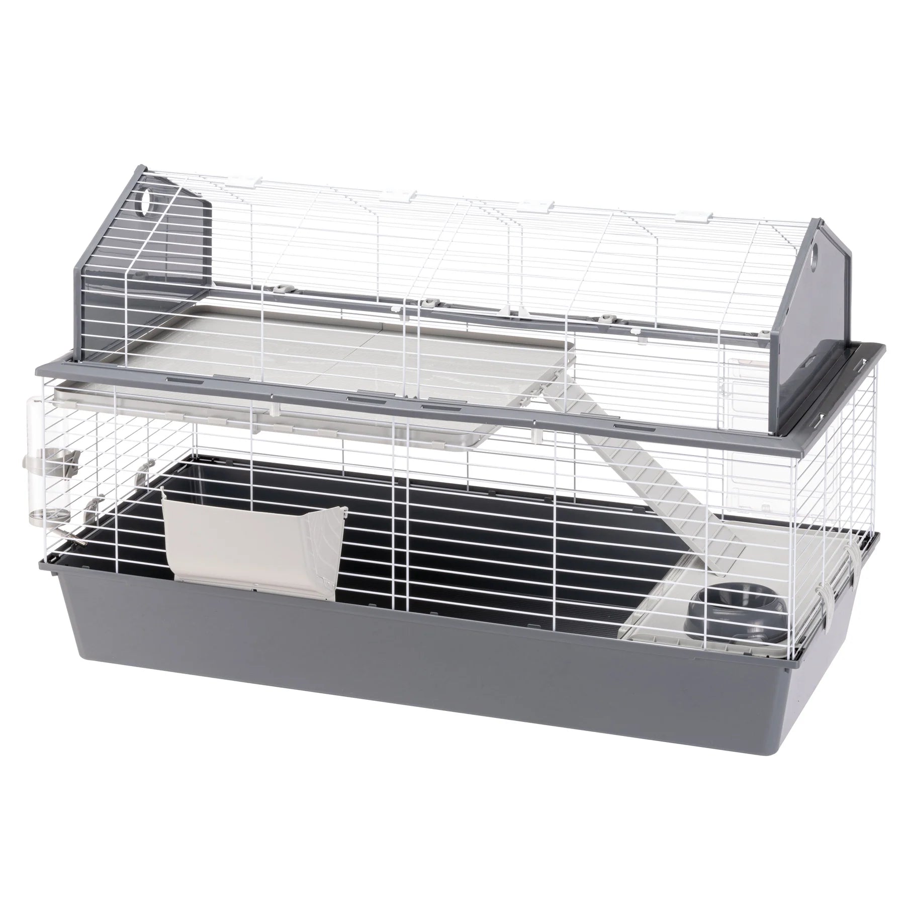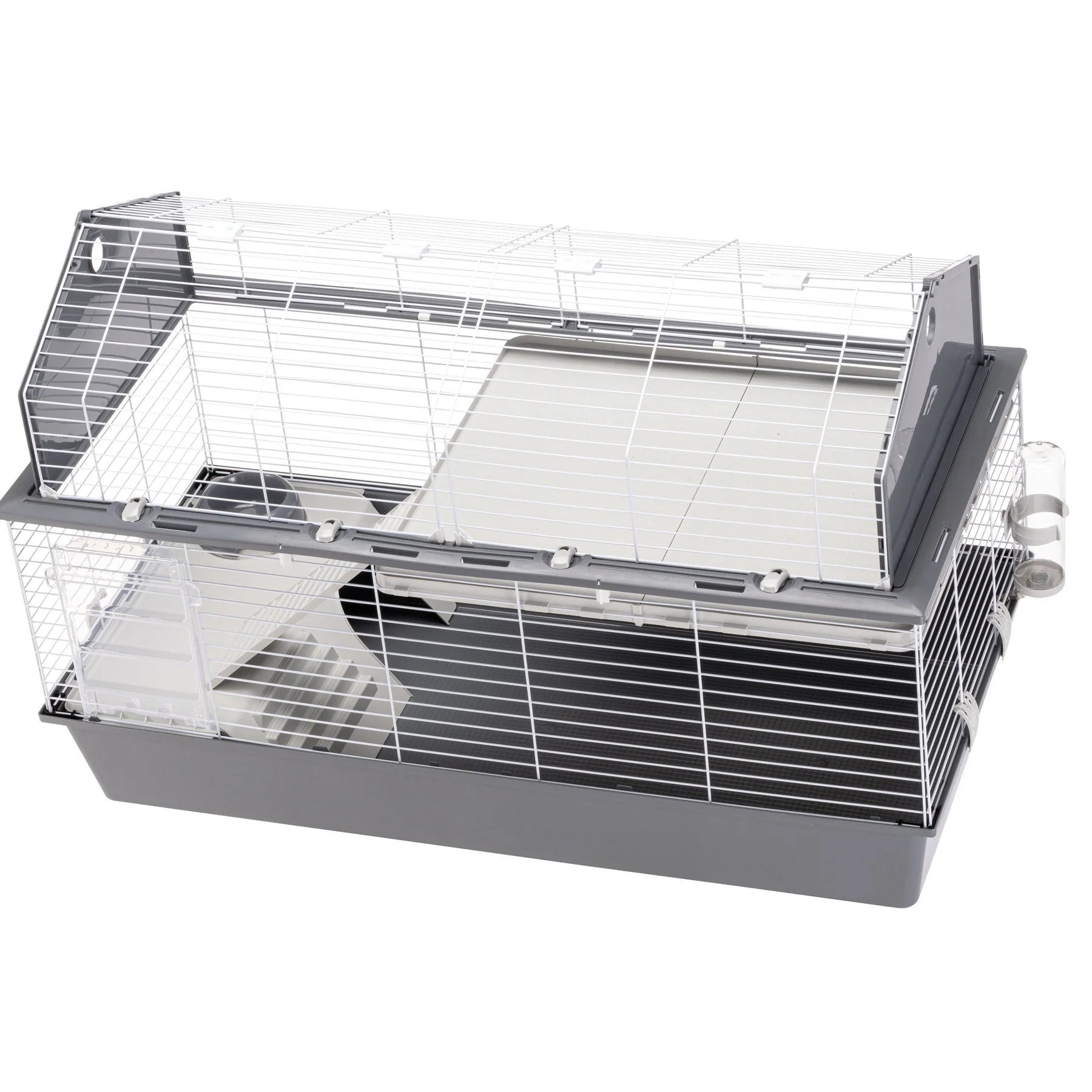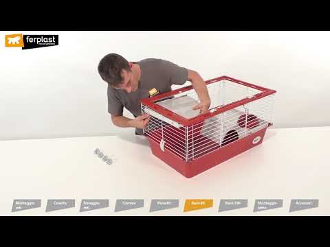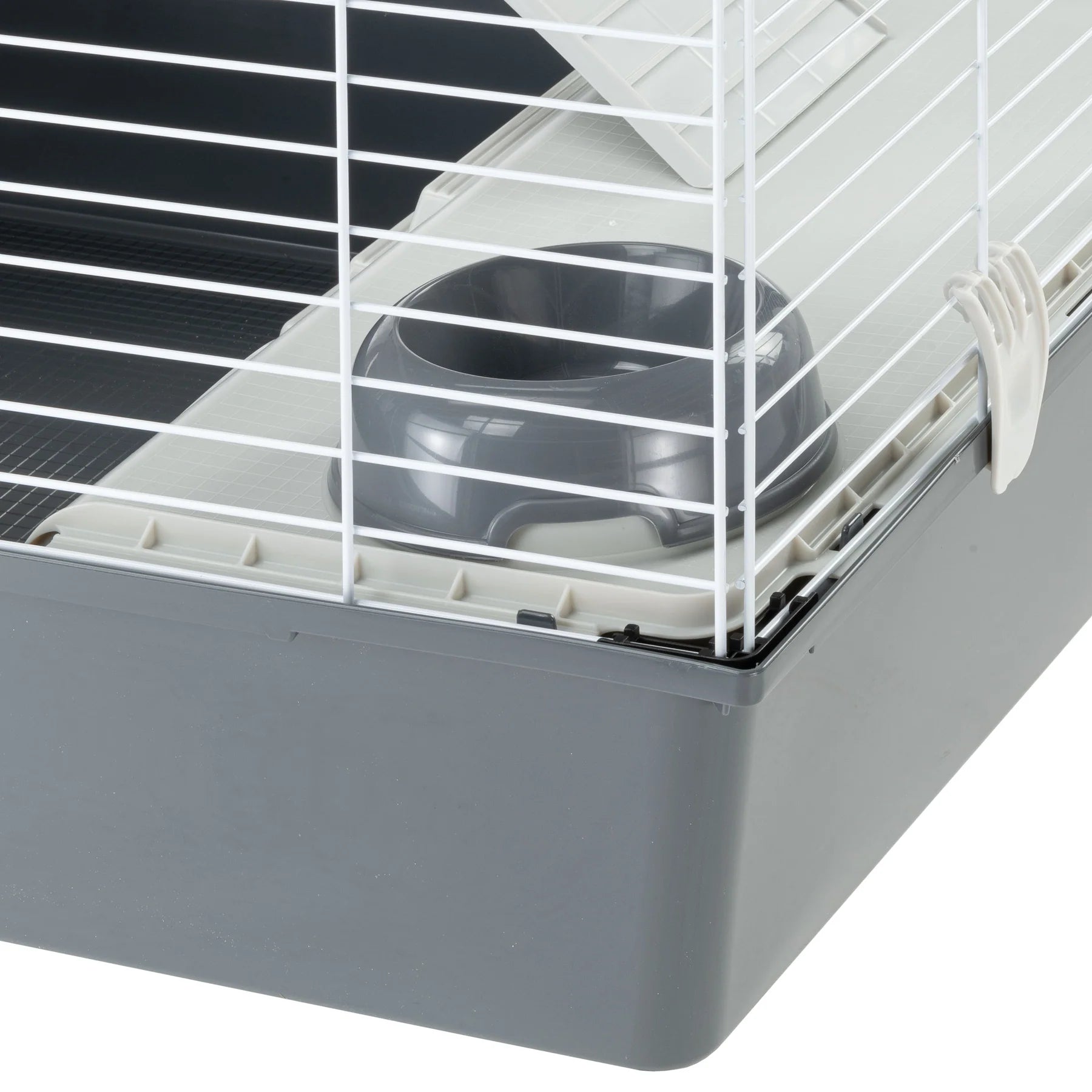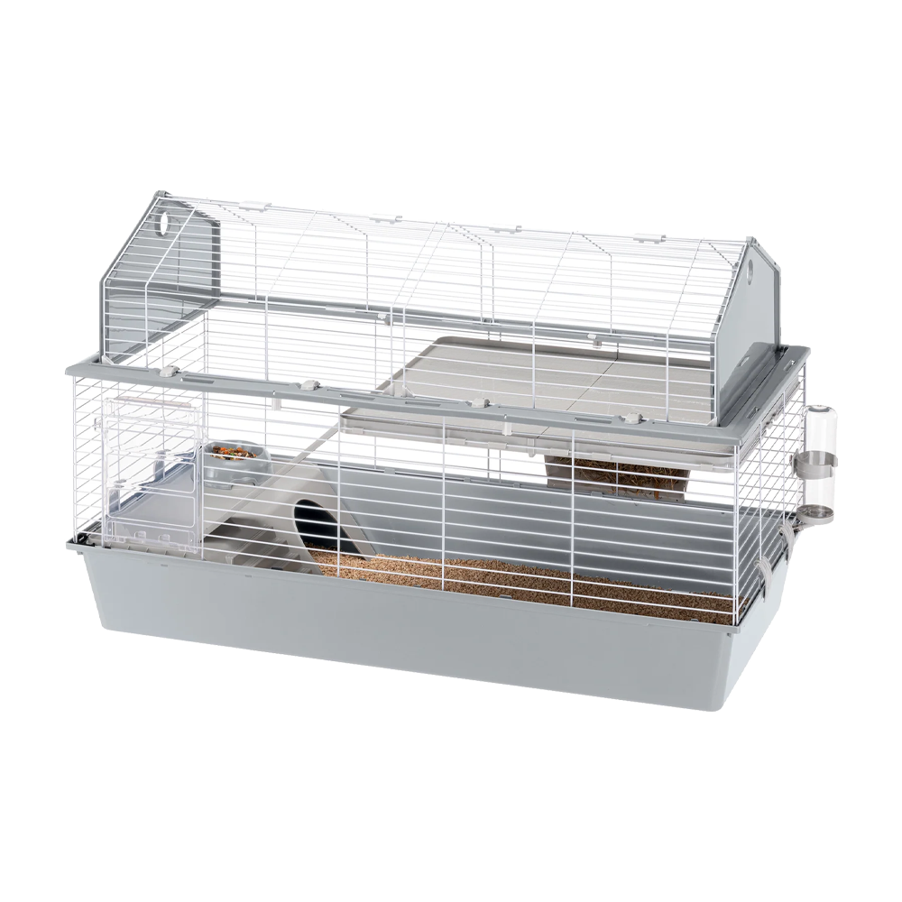 Burens botten är tillverkad av slitstark termoplast som effektivt håller kvar strö, sågspån och smuts, medan gallret är gjort av lackerad metall för lång hållbarhet. Den smarta planlösningen erbjuder både ett nedre viloutrymme med ett skyddande bo och ett övre plan som nås via ramp och stege, vilket skapar variation och stimulans. Stegen fungerar även som öppning och stängning av buren, vilket gör det enkelt för djuret att ta sig in och ut.