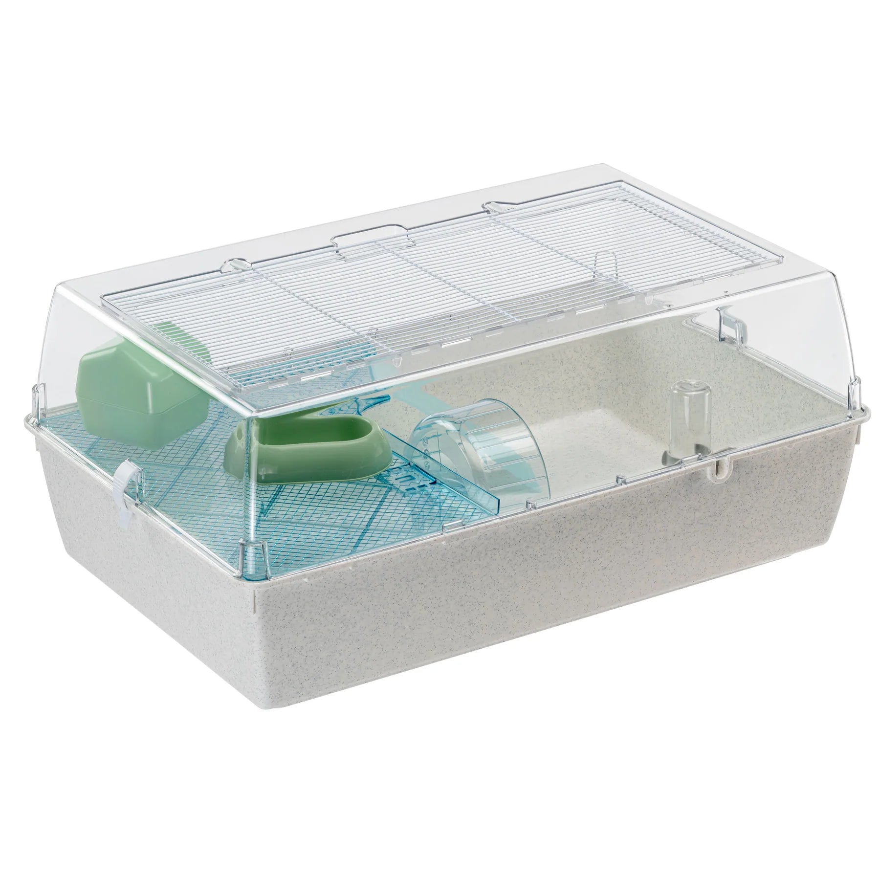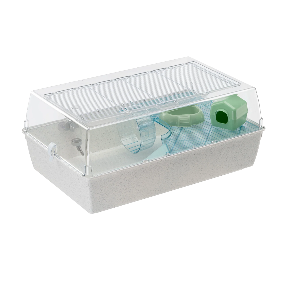 - Funktion: Konstruktionen består av en kraftig plastbotten och ett transparent plastlock med målat metallgaller som säkerställer god ventilation och full insyn. Gallret kan lyftas upp och låsas med vridbara hakar för säker och smidig åtkomst. Buren är modulär och kan kopplas ihop med andra moduler eller tillbehör för gnagare, vilket gör det möjligt att utöka livsytan över tid.