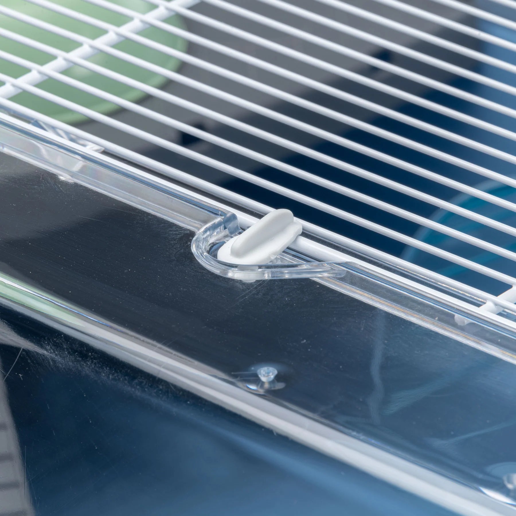 - Funktion: Konstruktionen består av en kraftig plastbotten och ett transparent plastlock som ger full insyn i djurets vardag. I locket finns ett målat metallgaller som säkerställer god ventilation och som enkelt kan lyftas och låsas med vridbara hakar för säker åtkomst. Botten och lock kan separeras helt, vilket gör rengöring snabb och smidig. Den modulära uppbyggnaden gör det möjligt att koppla ihop buren med andra moduler eller tillbehör för att skapa ett större och mer varierat habitat.