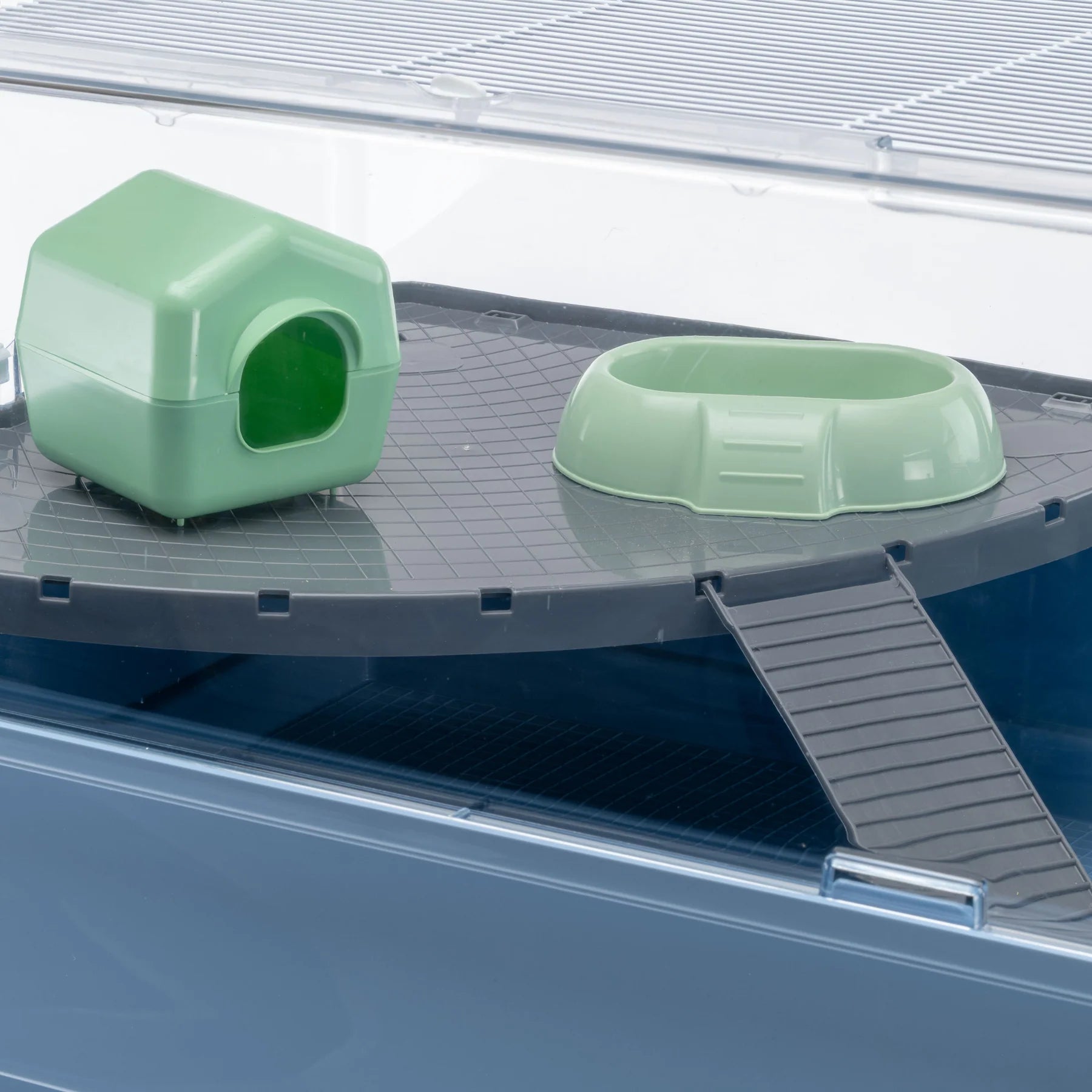 - Övrigt: Duna Hamster Maxi levereras komplett med tillbehör som matskål, vattenflaska, hylla med stege, löphjul och bo, vilket ger en färdig och trivsam miljö direkt från start. Buren är dessutom eco-sustainable och tillverkad av återvunnen plast och järn, vilket gör den till ett mer miljömedvetet val.