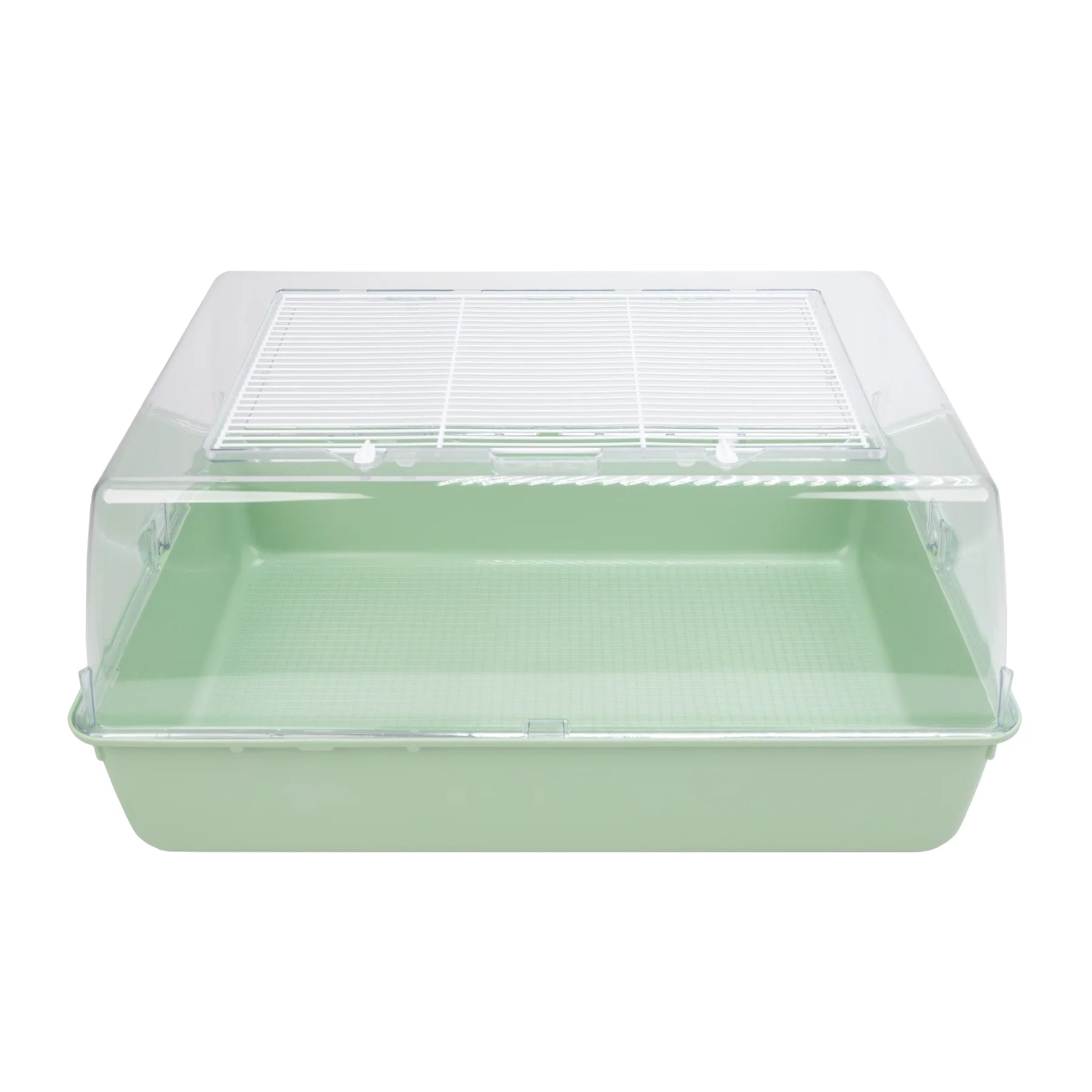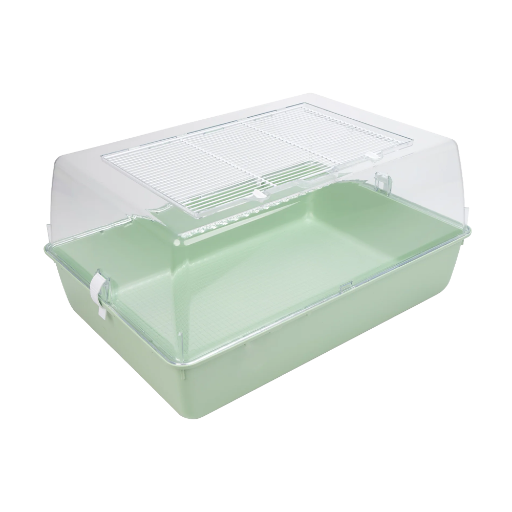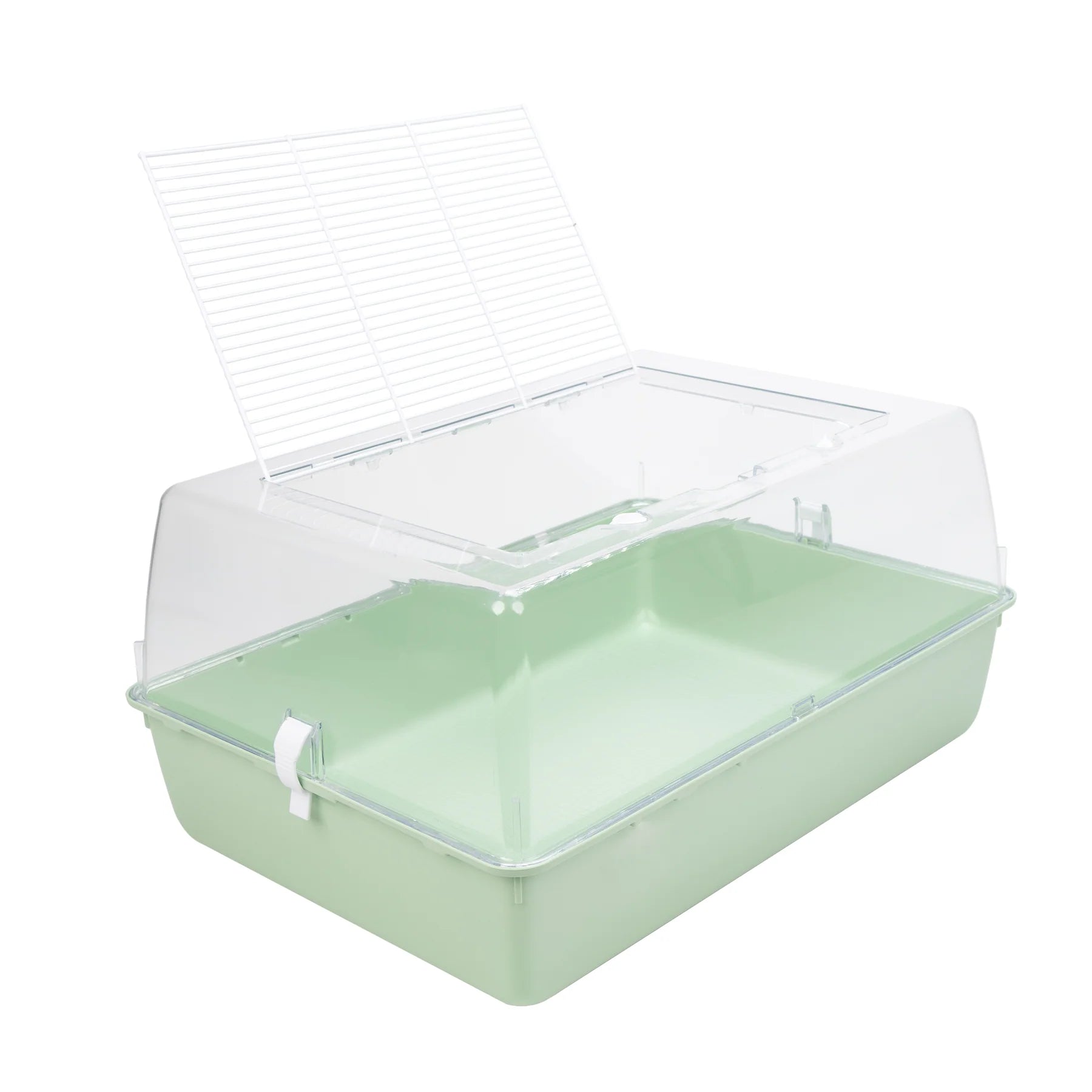 - Funktion: Det transparenta taket är utrustat med ett galler som säkerställer god luftcirkulation och kan öppnas helt för enkel åtkomst. Två säkerhetsclips håller gallret stadigt på plats och bidrar till att djuret hålls säkert. Den avtagbara botten gör rengöringen snabb och smidig.
