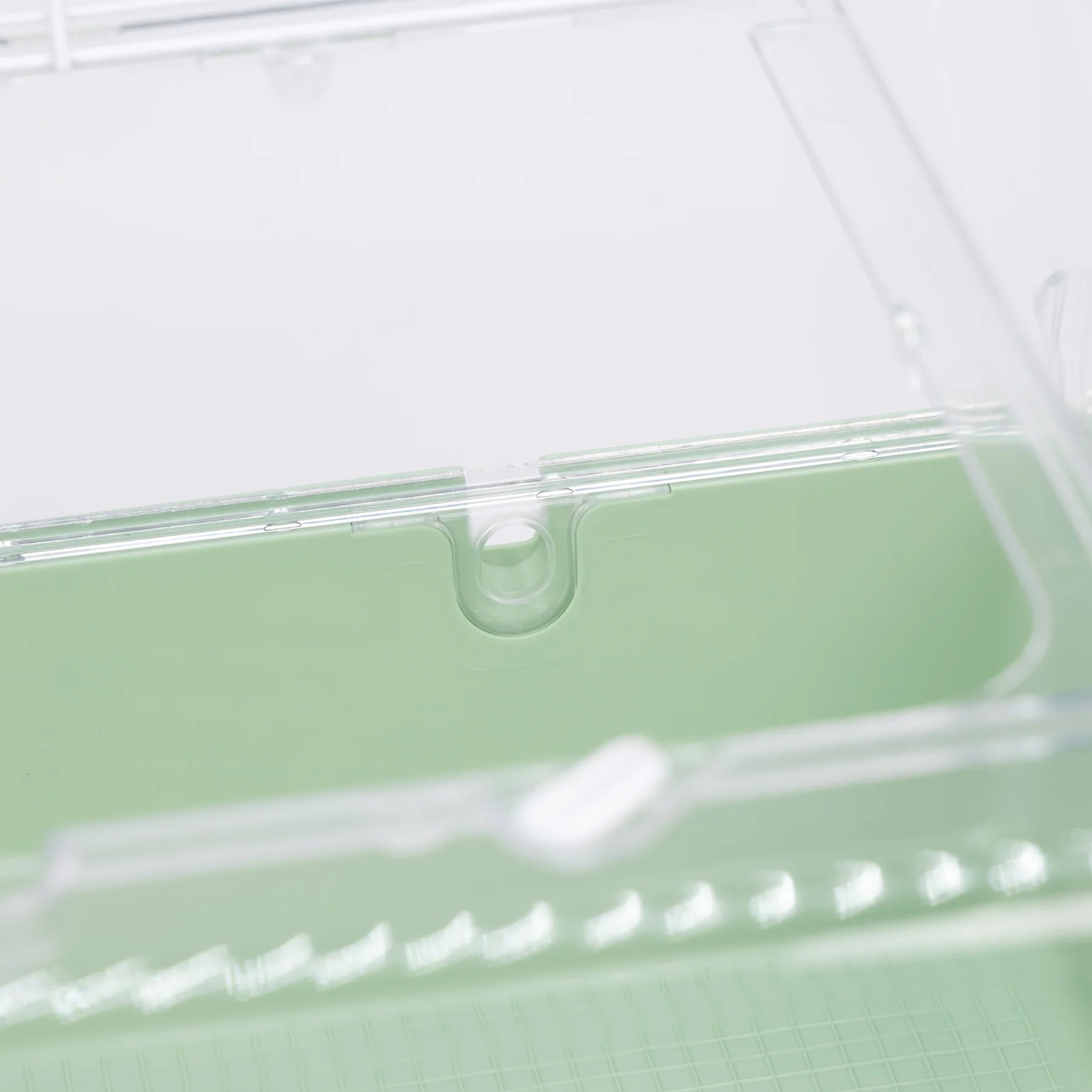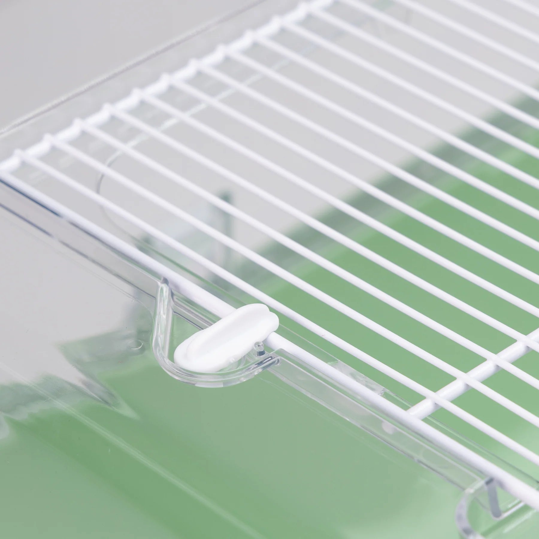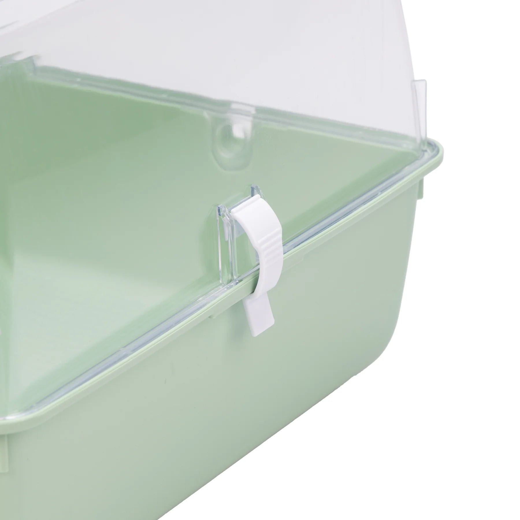 - Funktion: Det transparenta taket är utrustat med ett galler som säkerställer god luftcirkulation och kan öppnas helt för enkel åtkomst. Två säkerhetsclips håller gallret stadigt på plats och bidrar till att djuret hålls säkert. Den avtagbara botten gör rengöringen snabb och smidig.