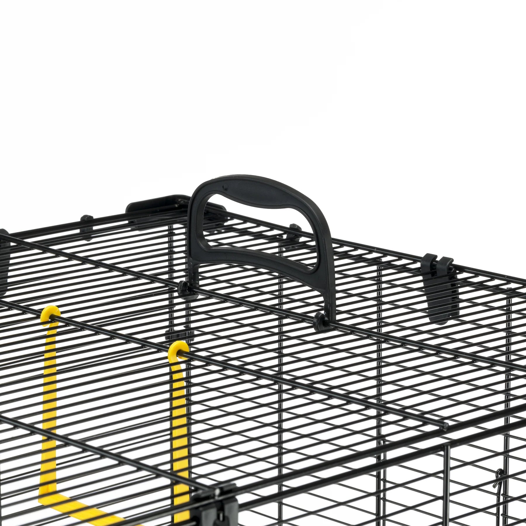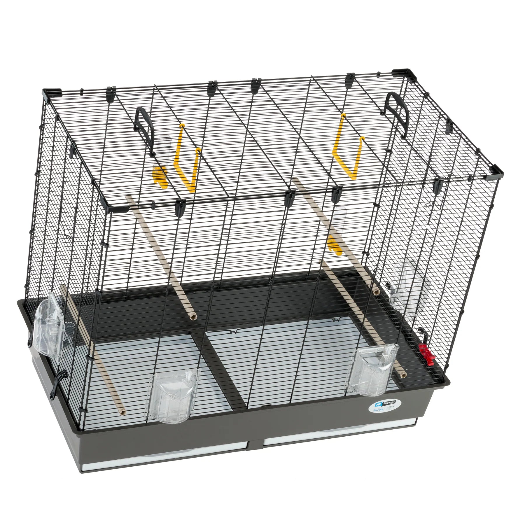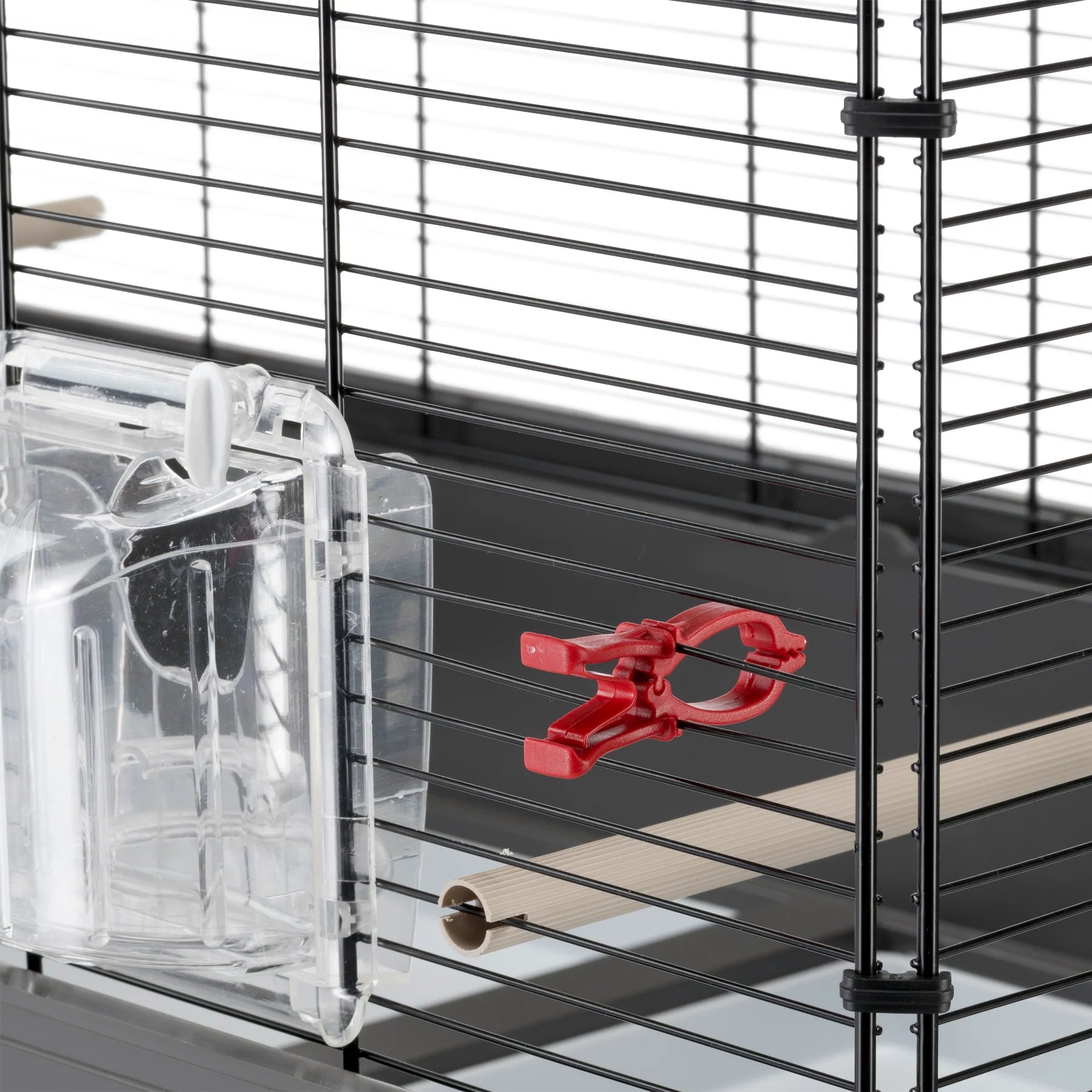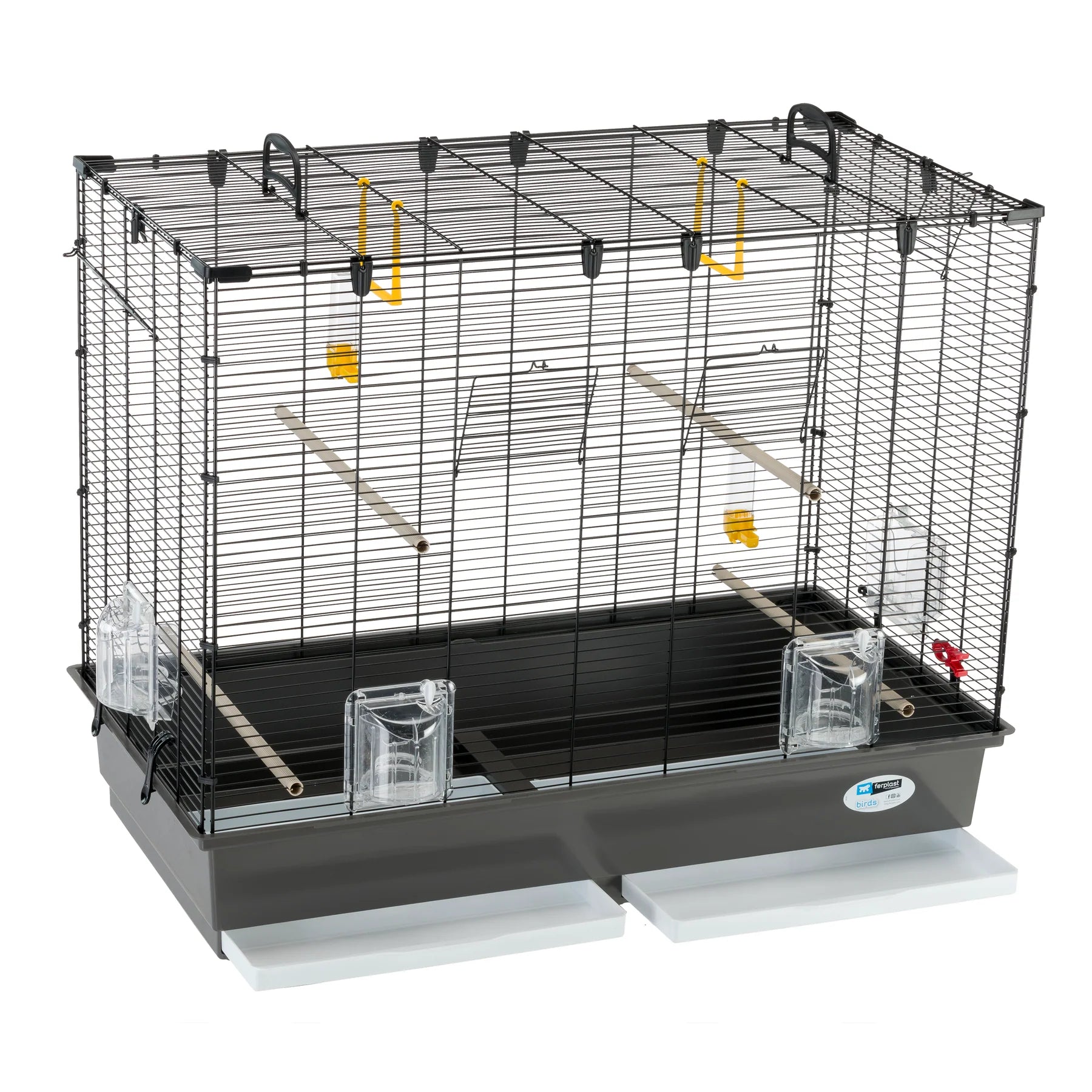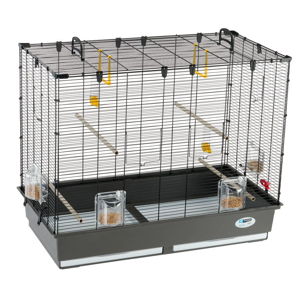 - Funktion: Den stabila metallgallret är ytbehandlat för att motstå korrosion och kompletteras av ett plastunderrede med två utdragbara lådor som gör rengöringen snabb och enkel. Taket är försett med handtag för smidig förflyttning och buren har flera åtkomstdörrar med säkerhetslås. De medföljande Brava 2-automaterna kan fyllas utifrån genom att roteras, vilket minskar risken för att fåglarna smiter.
