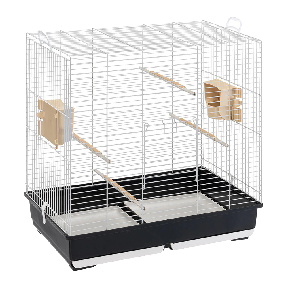 Sonia Large är en rymlig och klassiskt utformad fågelbur som passar utmärkt för undulater, nymfparakiter och andra liknande fåglar. Den rektangulära formen ger ett generöst innerutrymme och skapar en trygg och bekväm miljö där fåglarna kan röra sig fritt, vila och äta i lugn och ro.