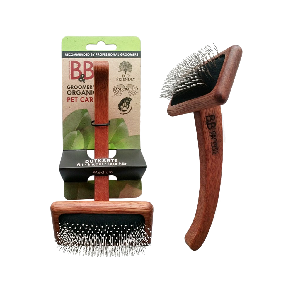 En skonsam karda med vinklade piggar och skyddande knoppar som effektivt reder ut tovor, knutar, lösa hår och underull – perfekt vid fällning. Det ergonomiska handtaget i hållbart Tamanu-trä ger ett stabilt och bekvämt grepp. Kan med fördel kombineras med en av B&B:s kammar (guldkam, lättviktskam eller rullekam) för att säkerställa att pälsen blir helt fri från tovor.
