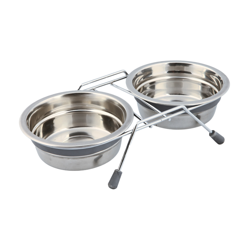 En elegant forkromet metalbar med to skåle i rustfrit stål, designet til at stå stabilt og give et behageligt spiseområde. Silikoneringe omkring skålene dæmper lyd og gør den raslefri, mens silikonefødder forhindrer bardisken i at glide.