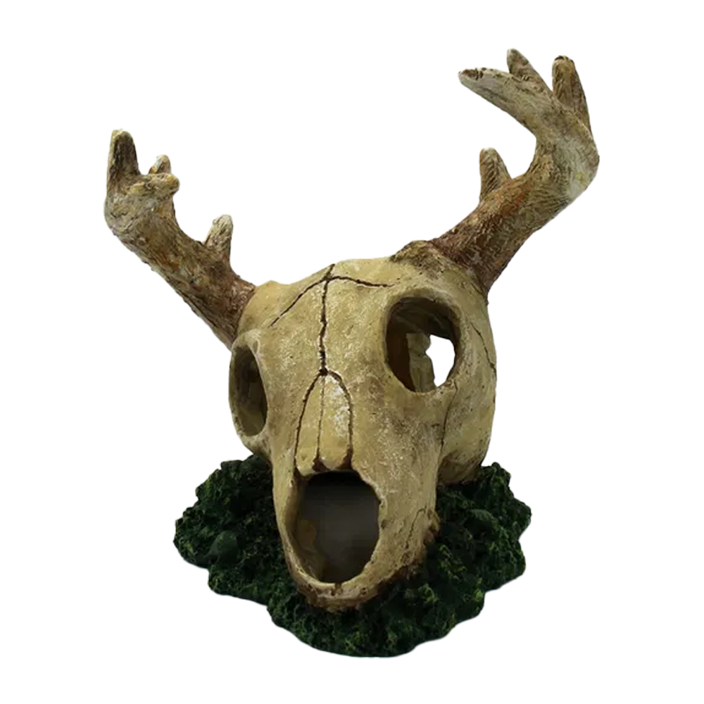 Detta realistiska hjortkranium skapar en dramatisk och naturlik miljö i både akvarium och terrarium. Den detaljerade designen ger en autentisk känsla av naturens vildhet och fungerar samtidigt som gömställe för fiskar eller reptiler.