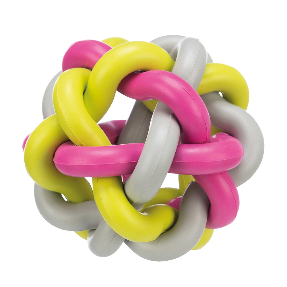 En slidstærk gummibold med knudemønster, der masserer tandkødet og fremmer mundhygiejne, når den tygges. Den hopper uregelmæssigt og er perfekt til både at kaste og til at lege alene. Materialet er fleksibelt, men holdbart, hvilket gør den velegnet selv til hunde med stærke kæber.