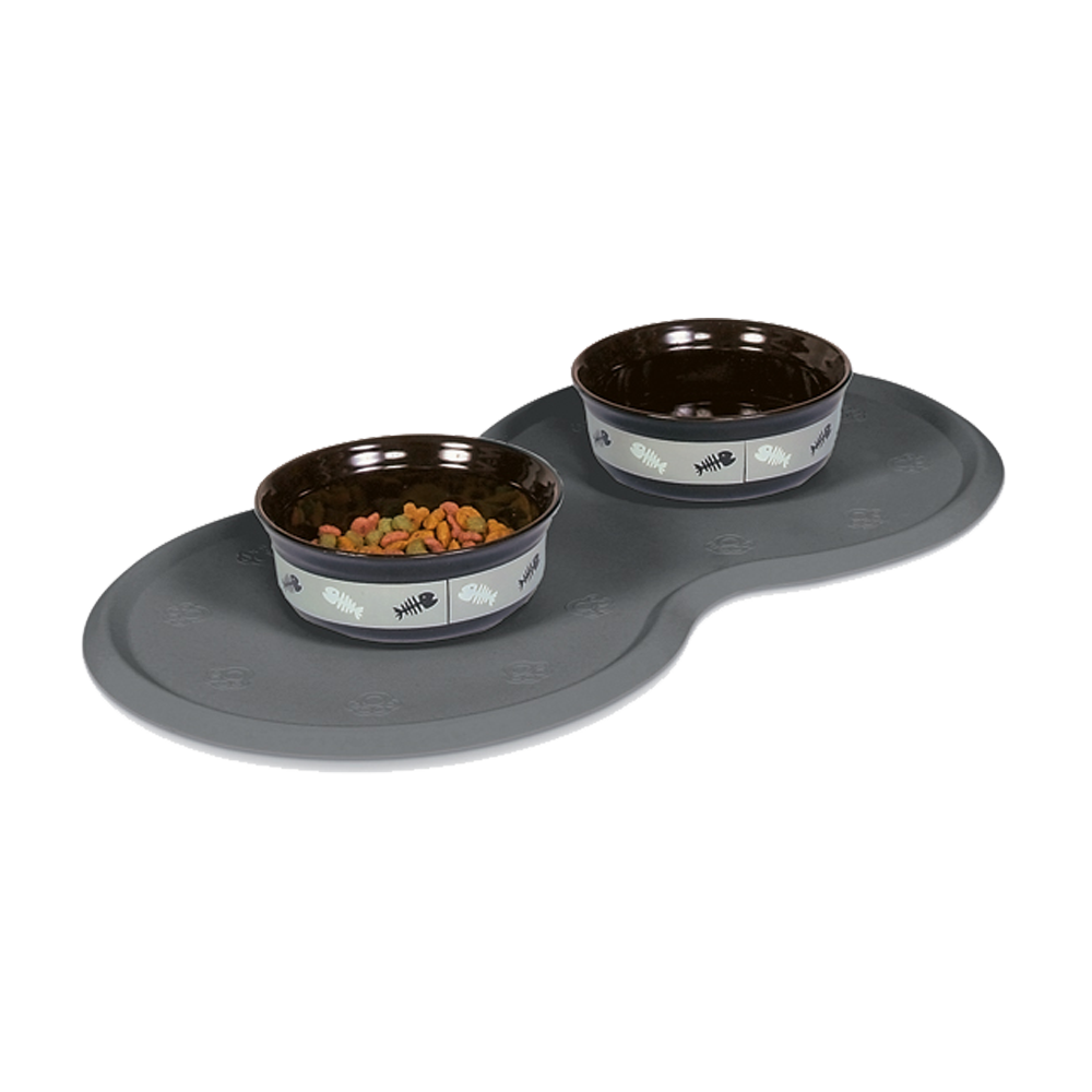 Skridsikker måtte af naturgummi med hævet kant, der holder mad- og vandskåle på plads og forhindrer spild. Passer til skåle op til ø 21 cm.