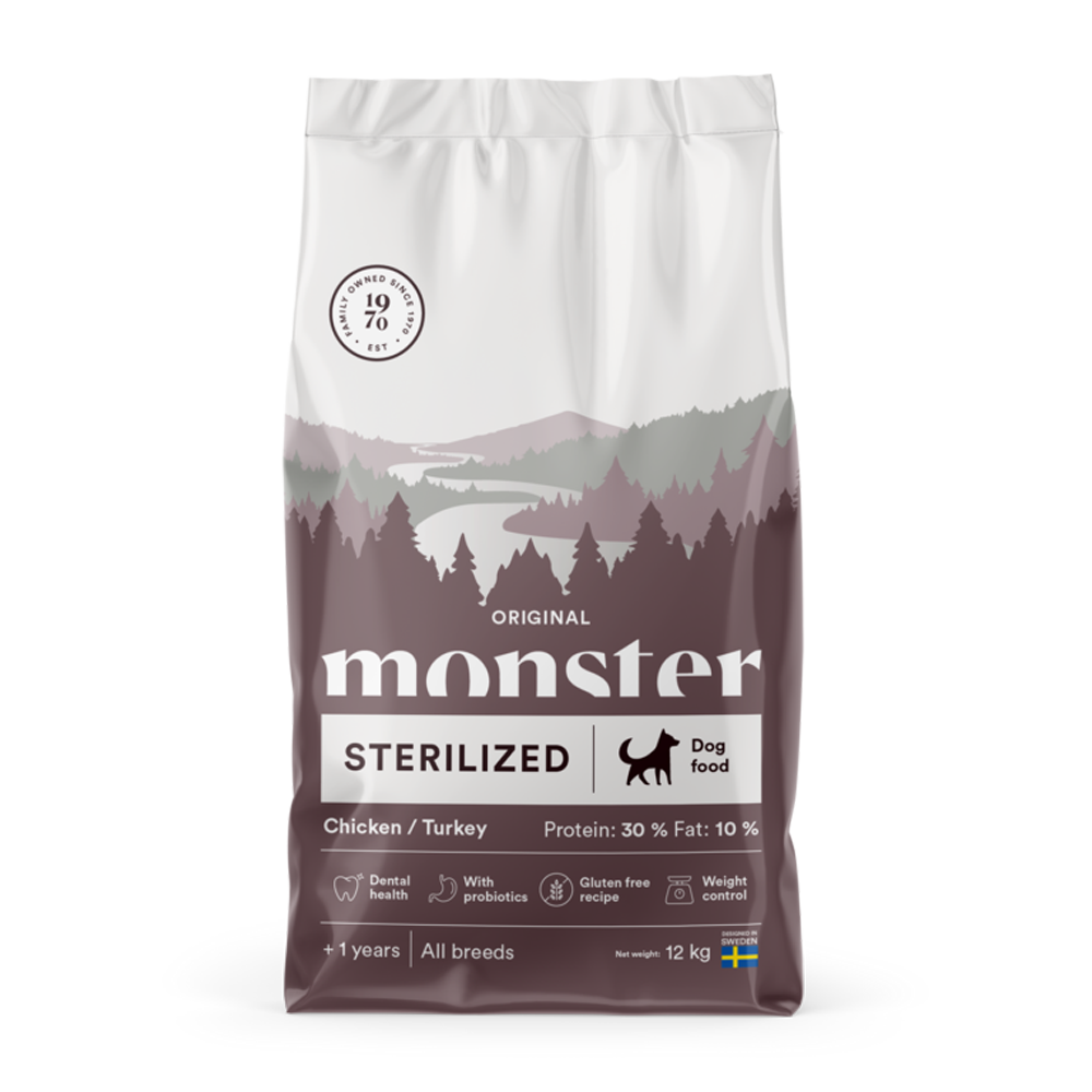 Monster Dog Orig. Sterilized Chick/Turkey är ett komplett helfoder med kyckling och kalkon som är särskilt anpassat för hundar med tendens att gå upp i vikt och som behöver ett mer kontrollerat energiintag. Receptet ger balanserad näring med lägre fetthalt samtidigt som smaken och måltidsglädjen bevaras för hundens dagliga utfodring.