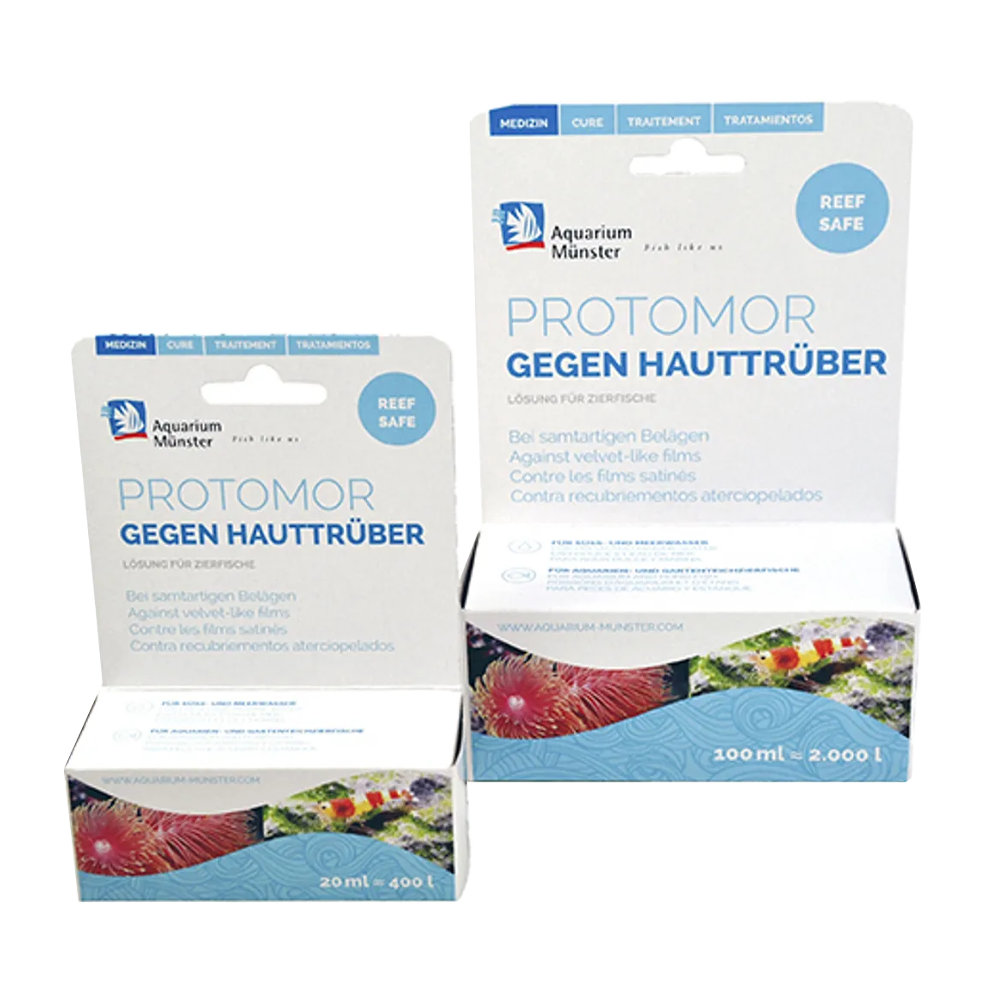 Münster Protomor är en mild men effektiv behandling för akvariefiskar mot tidiga stadier av infektioner orsakade av protozoer, såsom vita prickar och sammetsliknande beläggningar. Produkten är särskilt utformad för att vara säker att använda även i akvarier med känsliga ryggradslösa djur som koraller, anemoner, snäckor och musslor.