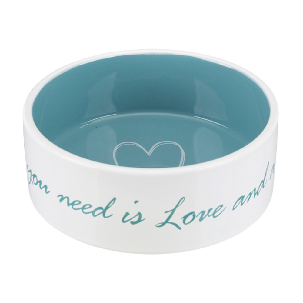 En charmerende keramikskål med en lyseblå bund, dekoreret med poteaftryk formet som et hjerte og teksten "All you need is love and a Pet!" Den robuste keramik gør skålen stabil og holdbar, samtidig med at den tilføjer en personlig og varm følelse til hjemmet.